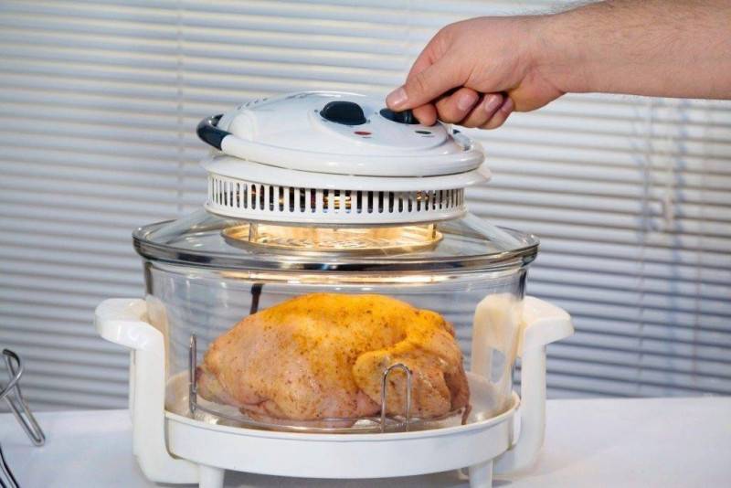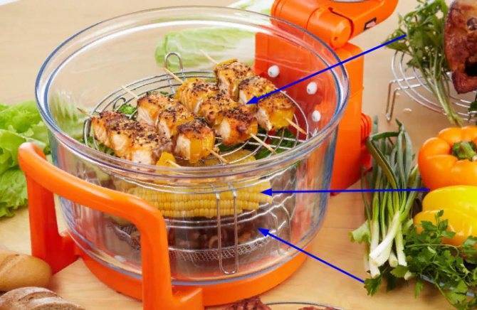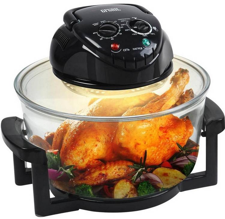 Конструкция представляет собой стеклянную чашу на подставке из пластика, ее минимальный объем – 2 л, максимальный – 12 л. В ней находится металлическое кольцо, с помощью которого при необходимости можно увеличить вместимость прибора. Чаша закрыта закрепленной или снимающейся крышкой, а над ней – блок управления. В крышке находятся функциональные детали: элемент нагревания и вентилятор. В конструкцию могут входить шампуры, сетка для паровой обработки продуктов, разделительные решетки, чтобы готовить одновременно несколько блюд.