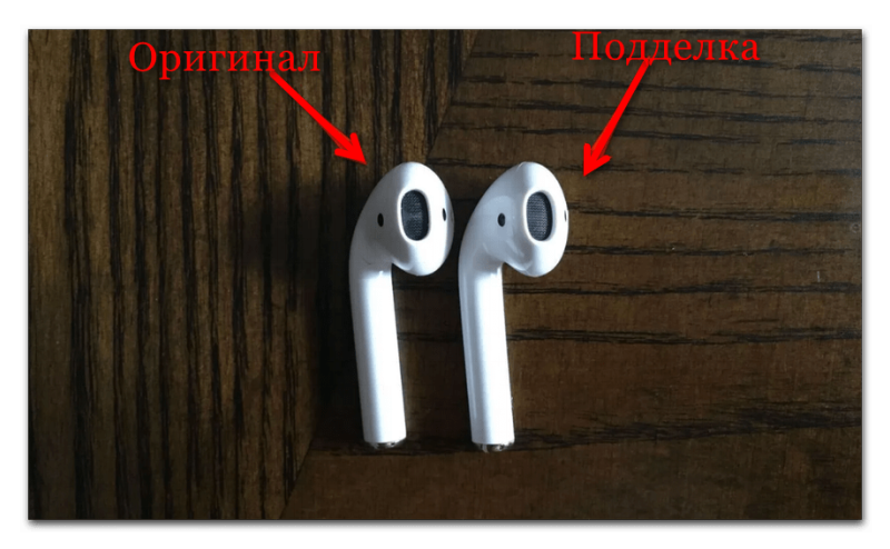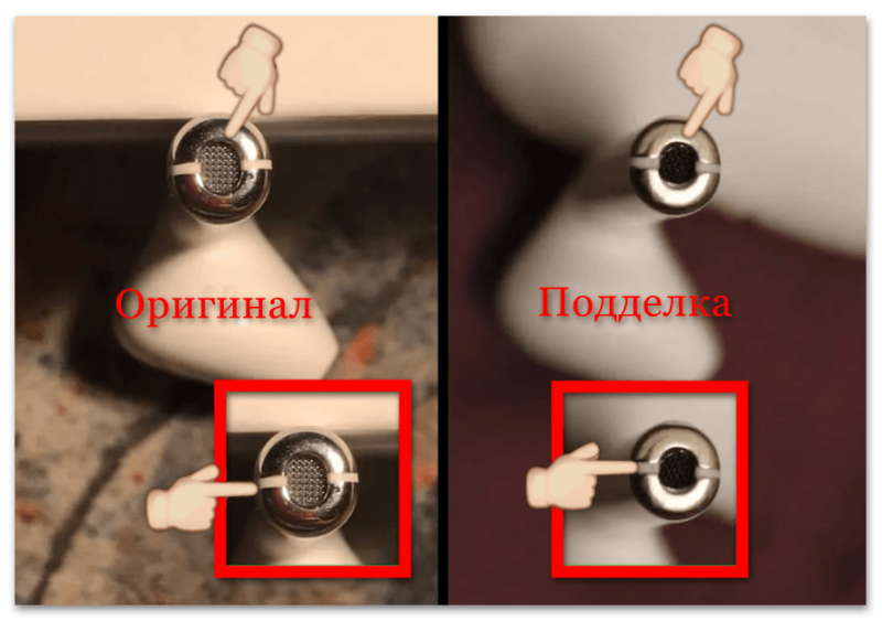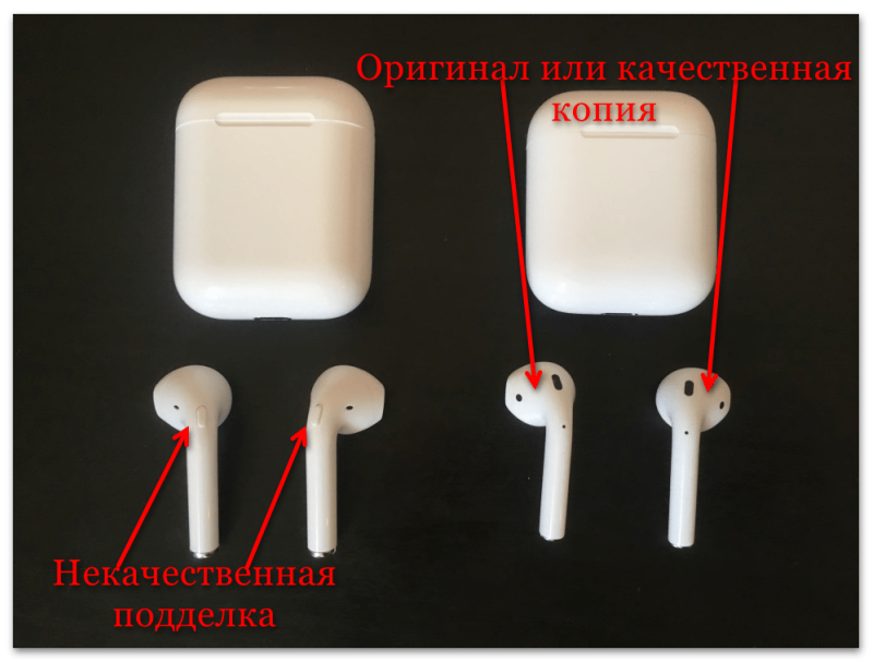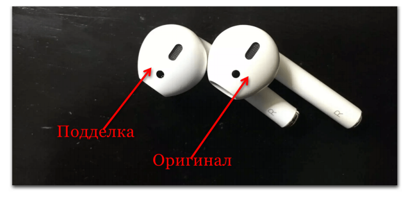 - у оригинальных AirPods на «ушах» есть отверстие диаметром 1–2 мм для микрофона, в китайских репликах его часто не делают;