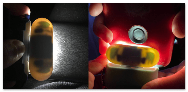 Еще одним вариантом проверки зарядного кейса на оригинальность является его просвет в темном помещении. Включите на телефоне фонарик, откройте крышку аксессуара и поднесите впритык к источнику света. «Внутренности» должны выглядеть так, как это показано на фото ниже. У подделки же они могут быть совершенно разными, а то и вовсе отсутствовать.