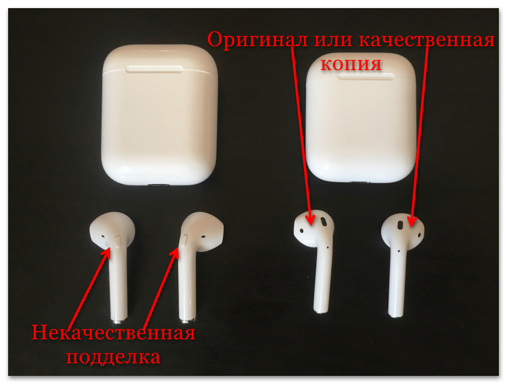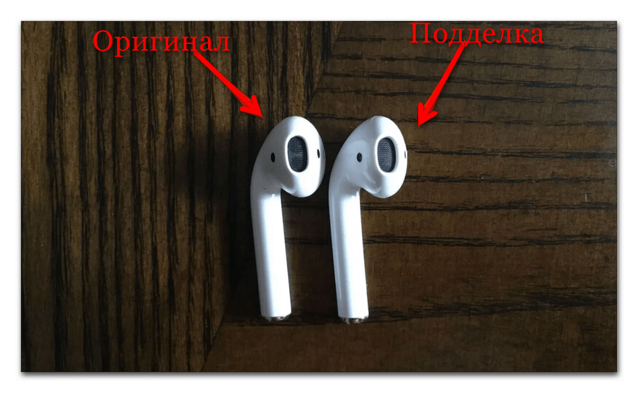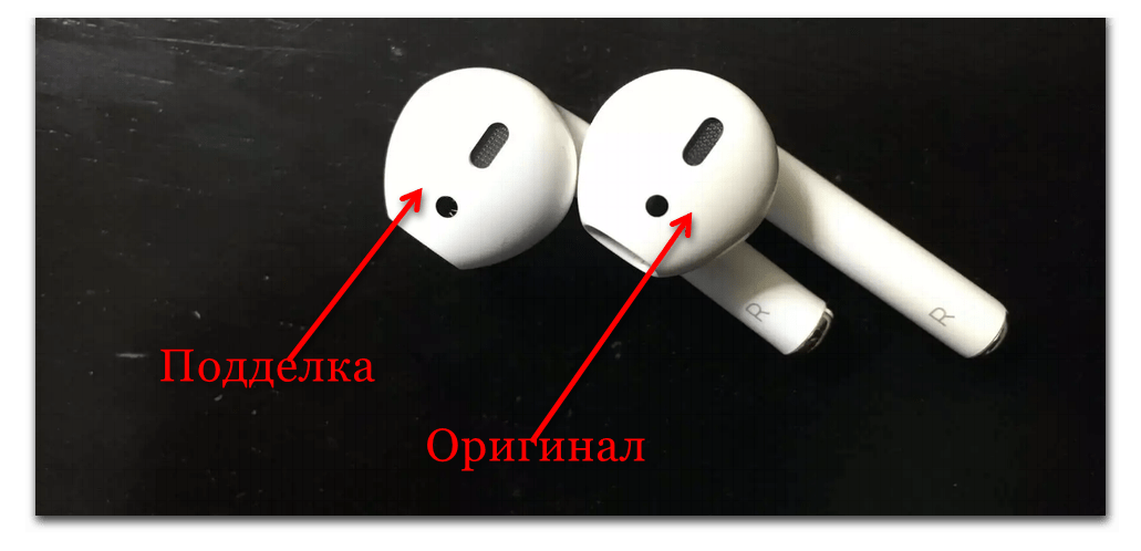- у оригинальных AirPods на «ушах» есть отверстие диаметром 1–2 мм для микрофона, в китайских репликах его часто не делают;