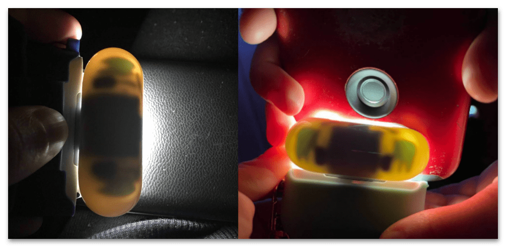 Еще одним вариантом проверки зарядного кейса на оригинальность является его просвет в темном помещении. Включите на телефоне фонарик, откройте крышку аксессуара и поднесите впритык к источнику света. «Внутренности» должны выглядеть так, как это показано на фото ниже. У подделки же они могут быть совершенно разными, а то и вовсе отсутствовать.