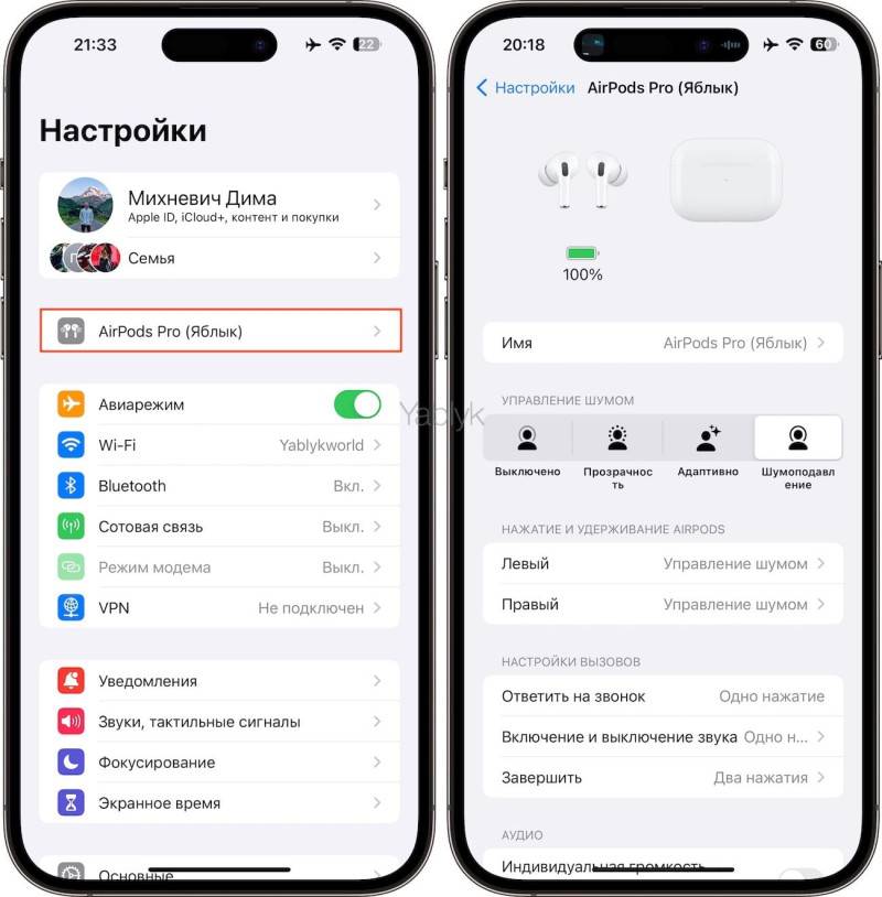 Раздел настроек копии наушников AirPods Pro 2 от Hulian с чипом 277 H2S Ultra в точности повторяет оригинальный