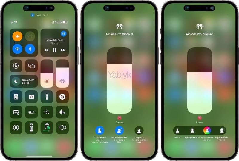 Настройки режимов шумоподавления копии AirPods Pro 2 от Hulian с чипом 277 H2S Ultra в Пункте управления в точности идентичны оригинальным