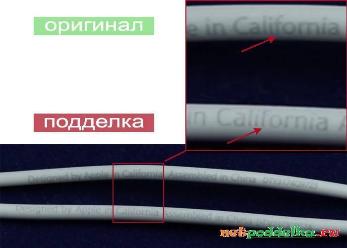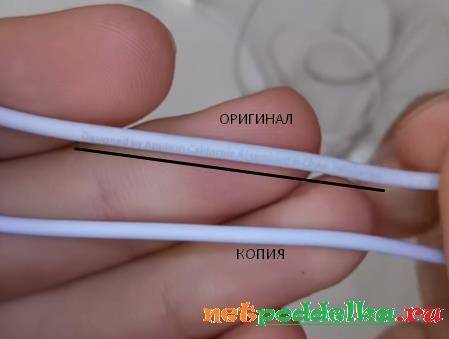Провод должен плотно прилегать к основанию устройства. У подделки же может быть зазор или щель, что обычно приводит к повреждению элемента аксессуара. Кабель «натуральных» EarPods мягкий и гибкий, с оплеткой из прорезиненного пластика, который слегка пружинит и очень эластичен, а также имеет надпись с указанием серийного номера. Наличие ошибок в написании возможно лишь в копии наушников.