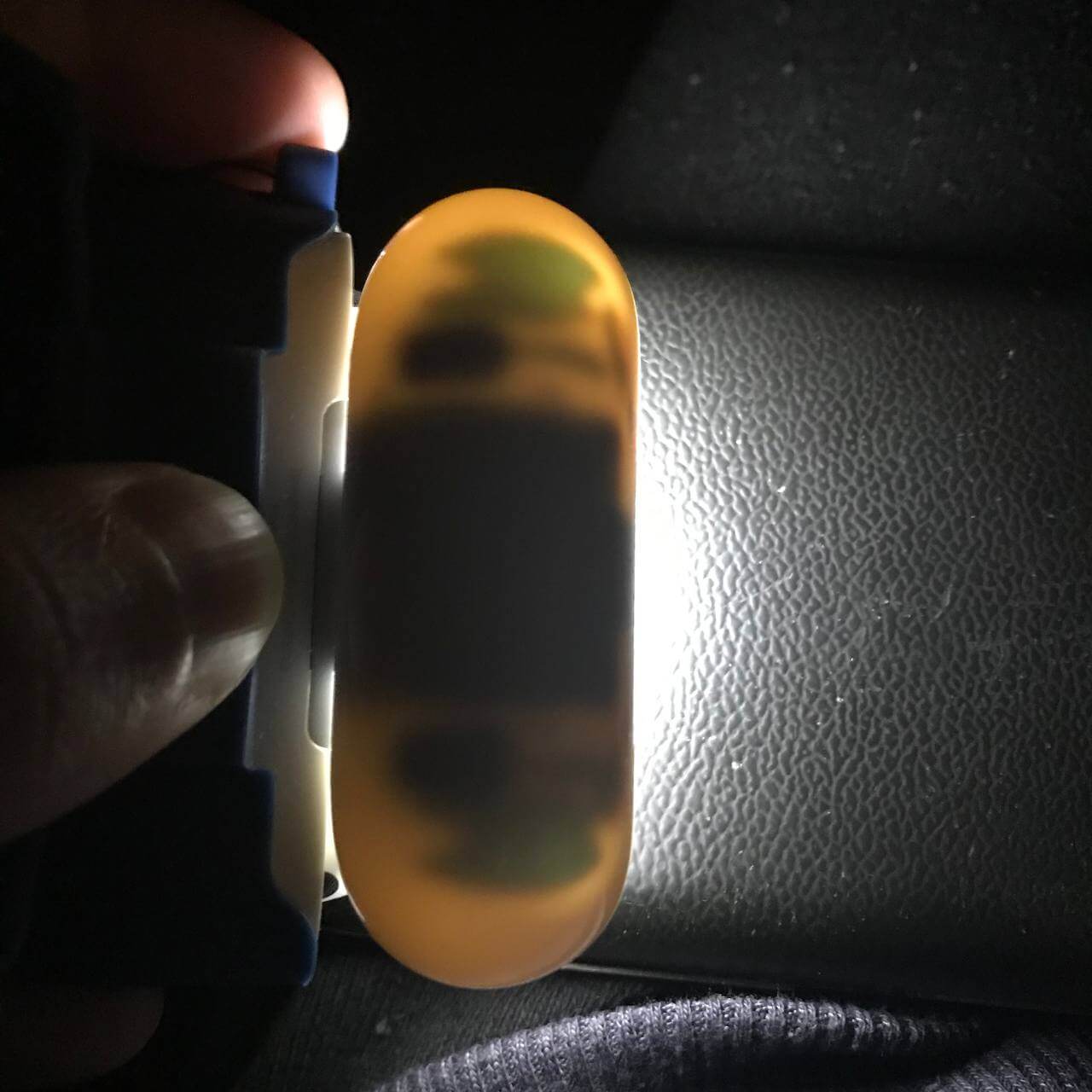 Ещё один приём, который можно задействовать, рассказали читатели в нашем чате в Telegram. Приложите телефон с включенным фонариком вплотную к крышке зарядного кейса, предварительно открыв её. Оригинальная крышка на просвет будет выглядеть так:
