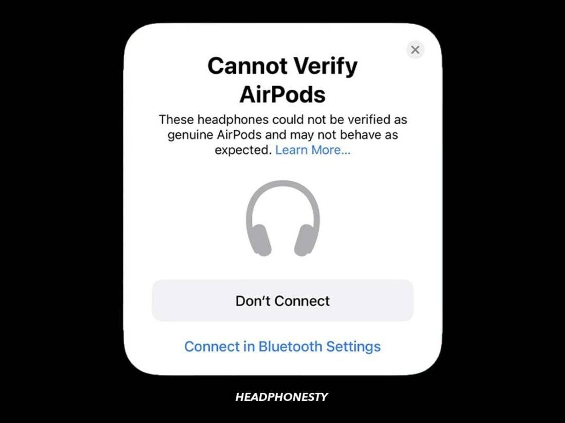 The alert reads, “These headphones could not be verified as genuine AirPods and may not behave as expected,” and has an optional “Don’t connect” button.