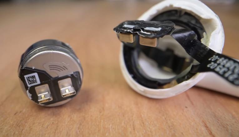 Как вы можете заметить, металлический контур, который размещен вокруг разъёма, более толстый на подделках, поэтому имеет другую форму. Кроме того, несмотря на то, что угол освещения в сравнении поддельных и реальных AirPods отличается, мы можем отметить разницу в цвете.