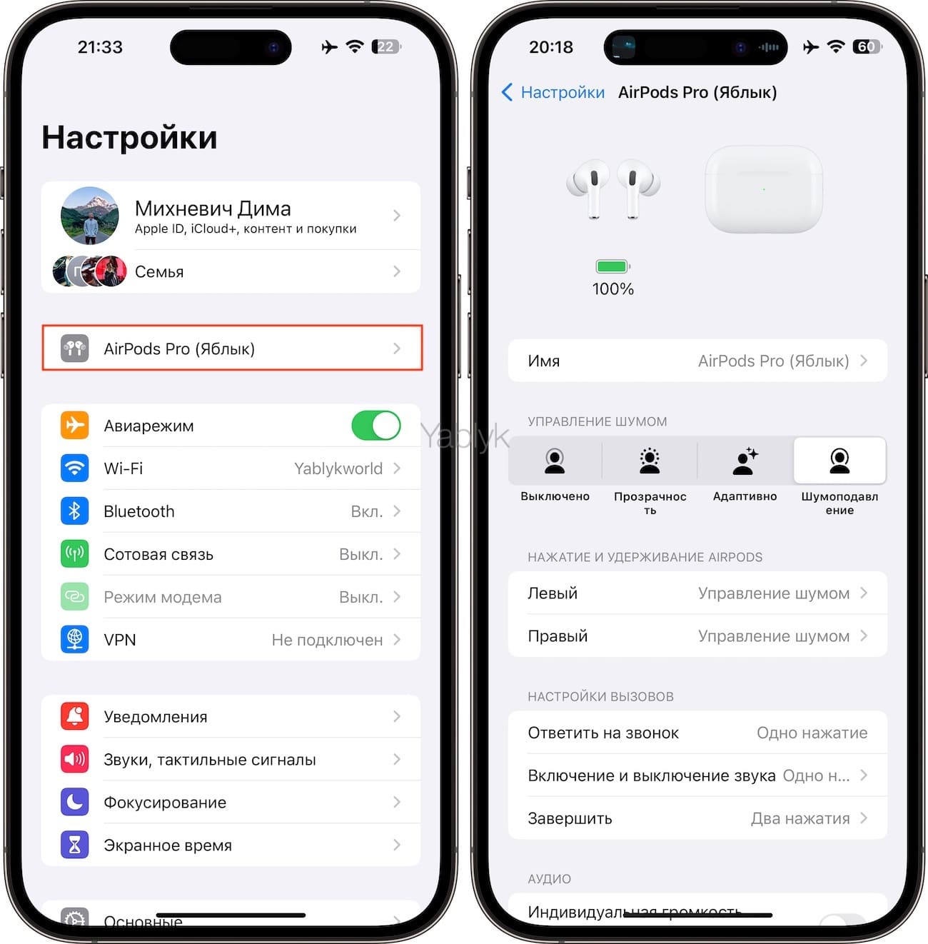 Настройки режимов шумоподавления копии AirPods Pro 2 от Hulian с чипом 277 H2S Ultra в Пункте управления в точности идентичны оригинальным
