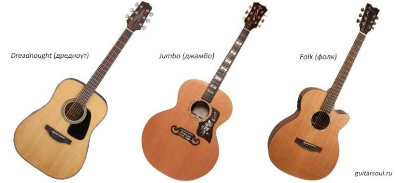 Каждая акустическая гитара, а их существует несколько видов, предназначена для определенного музыкального стиля и имеет свои отличительные особенности. Изделия имеют разную форму корпуса, строение грифа, размеры и количество струн. Так, различают обыкновенную классическую гитару, Джамбо, Дредноут, русскую семиструнную, Фолк и двенадцатиструнную.