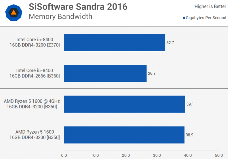 Хорошо, начнём с тестирования — это тест пропускной способности памяти SiSoftware Sandra, и здесь мы смотрим на устойчивую производительность чтения / записи в гигабайтах в секунду. Core i5-8400 на материнской плате B360 ограничен до 27 ГБ / с в качестве максимальной поддержки памяти, которую поддерживает этот чипсет DDR4-2666. Однако использование платы Z370 с памятью DDR4-3200 увеличило пропускную способность на 22% до 32,7 ГБ / с.