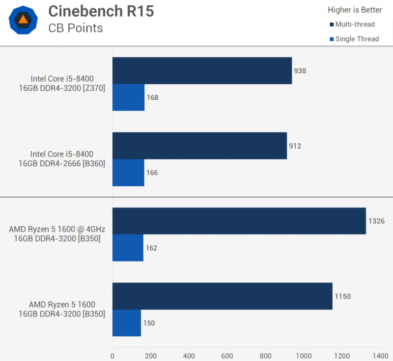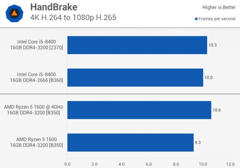 Демонстрация превосходной многопоточной производительности Ryzen — это тест V-Ray. Вместо оценки, такой как Cinebench, мы смотрим на время рендеринга здесь, измеряемое в секундах, поэтому лучше.Здесь мы видим, что запас Ryzen 5 1600 был на 16% быстрее, чем 8400 на плате B360 и на 13% быстрее, чем у Z370. Разгон 1600 улучшил производительность на 16%, и теперь процессор AMD по крайней мере на 31% быстрее, чем Core i5-8400.