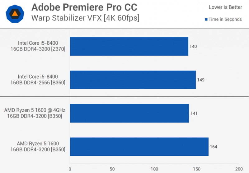 Когда речь заходит о редактировании видео, превосходный IPC процессора Core i5 и часто более высокие тактовые частоты, достигнутые при выполнении этих задач с легким резьбовым редактированием, дают Intel преимущество. Ryzen не совсем «замедлился» в сравнении, но это не случай для DAM для AMD, который мы видели в предыдущих тестах, и больше об изменении производительности, когда мы добираемся до Premiere Pro позже в видео.