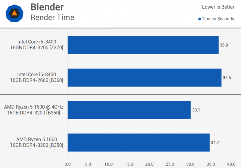Тем временем Ryzen 5 1600 был намного более голоден, но имейте в виду, что Blender полностью использует все 12 потоков, поэтому 65% -ный прыжок с запаса 8400 не так уж плох, поскольку у него на 100% больше потоков. По сравнению с конфигурацией Z370 маржа также значительно снижена, для этого сравнения процессор Ryzen был на 32% больше голода.