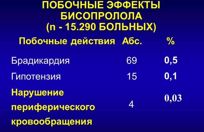 Побочные проявления от Бисопролола: боли в области головы с головокружениями, бессонница, психические расстройства, нарушение чувствительности в конечностях.