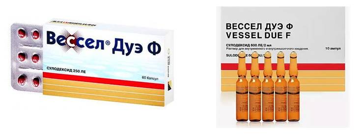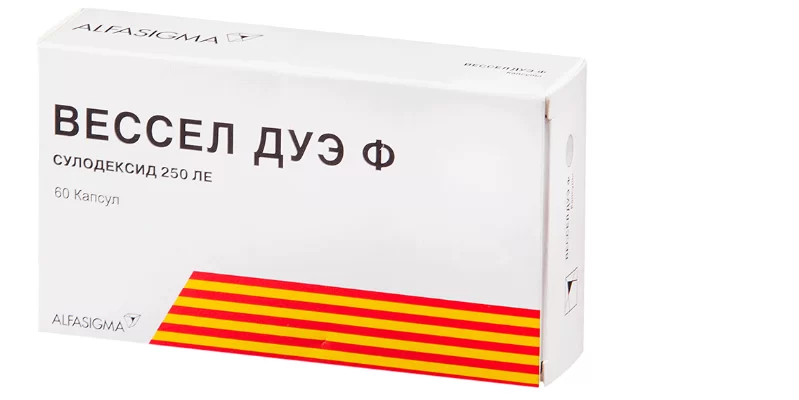 Вессел Дуэ Ф, это препарат с широким спектром активности и прямым антикоагулянтным действием обладает большим количеством лечебных свойств. Лекарство растворяющее тромбы, защищающее сосуды от любых повреждений, устраняющее эффект осаждения фибрина на стенках сосудистой рамификации, а также улучшающее кровоток, обмен веществ и повышающее стойкость сосудов к инфекциям продается в любой аптеке. Основным компонентом, является сулодексид. Лекарственное средство производится в желатиновых капсулах и инъекционных растворах. Выпускается по рецептам.