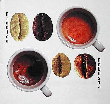 Зёрна арабики и робусты существенно отличаются на вид. У первого вида они доходят до 8 мм и имеют овальную форму. После обжарки зёрна имеют ровный коричневый цвет.По форме зерно робусты ближе к кругу. Они меньше по размеру, чем у арабики. После обжарки цвет зёрен не становится однородным, они могут иметь несколько оттенков коричневого.