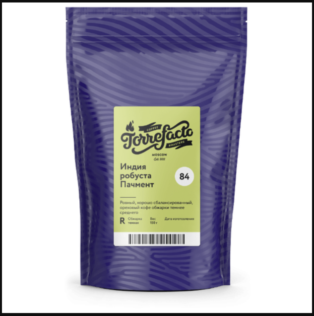Торрефакто Индия Бобовый пергамент. Идеально подходит для заваривания в турецкой, французской кофемашине и различных типах кофемашин. Вкус с нотками шоколада, лесного ореха и какао. Присутствует характерная горчинка сорта.
