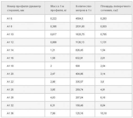 | Номер профиля (номинальный диаметр стержня), мм | Масса 1 м профиля, кг | Количество метров в 1 т | Площадь поперечного сечения, см2 |