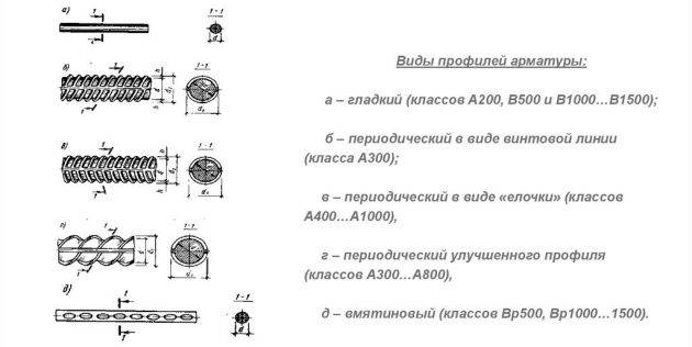По технологии изготовления: горячекатаная, холоднокатаная и катаная арматура. По характеру профиля разделяют: периодического профиля, рифленая (классы А2, А3, А4 и А5) и арматура гладкая (класс А1). По условиям эксплуатации конструкций: напрягаемая и ненапрягаемая. По ориентации в конструкции: поперечная и продольная