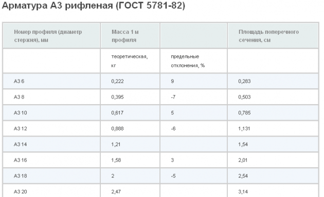 В настоящее время арматура класса а3, а также и других классов, выпускается в виде стержней диаметром от 6 до 40 мм и длиной от 6 до 12 м, а также в стержнях немерной длины. При этом если вы собираетесь арматуру строительную купить, то следует знать, что её цена рассчитывается преимущественно по весу и измеряется в тоннах. Таким образом, вес 1 погонного метра арматуры диаметром 6 мм будет составлять 0,222 кг, а диаметром 20 мм – 2,47 кг. В целом подробная таблица соотношения диаметра и веса арматурной стали приводится в ГОСТ 5781-82, в соответствии с которым и рассчитывается стоимость 1 погонного метра арматуры каждого диаметра.