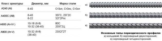 - рифленой поверхностью — рифленая арматура / арматурный прокат периодического профиля, классы: