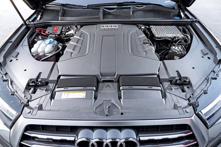Гидравлические опоры эффективно гасят вибрацию работающего шестицилиндрового двигателя Audi Q7 с 600 Нм крутящего момента на пике. Автомобиль движется тихо, плавно и напористо, в то время как 8-ступенчатая автоматическая коробка перебирает скорости. С такой силой ошибки в выборе передач практически не возможны. Нагрузка в самоблокирующемся межосевом дифференциале распределяется так: 40% вперед и 60% назад. Это позволяет уравновесить устойчивость и управляемость.