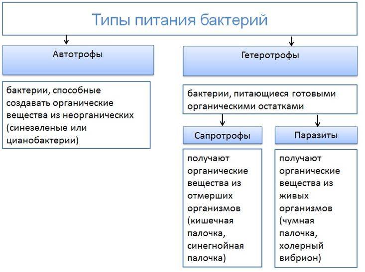 По типу питания бактерии можно разделить на две группы: автотрофы и гетеротрофы. Остановимся подробнее на особенностях этих групп.