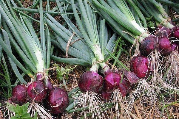 Красный лук обычно собирают во второй половине августа и начале сентября. Рекомендуется за неделю подрезать корни лопатой – урожай будет собирать легче, луковицы лучше подсушатся.