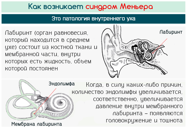 - повышенная выработка жидкости во внутреннем ухе (синдром Меньера);