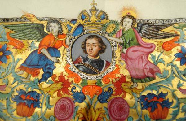 Портрет Петра I на титульном листе Жалованной грамоты Петру Толстому. 1709 год