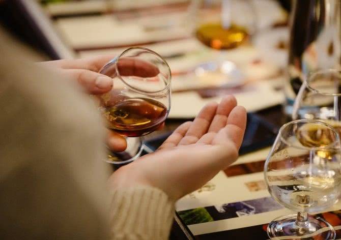 Для определения вкусовых качеств продукта напиток необходимо налить в бокал и немножечко прогреть в руках. Наберите коньяк в рот и погоняйте по ротовой полости, чтобы прочувствовать оттенки вкуса, а затем проглотите.