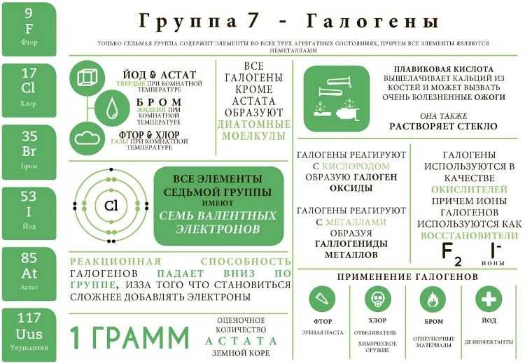 Нужно также обратить внимание и на то, какой кристаллический рисунок имеют вещества этой группы. Галогены обладают интересной решёткой. Атомы в количестве 2-х единиц, содержат на внешнем энергетическим уровне 7 электронов