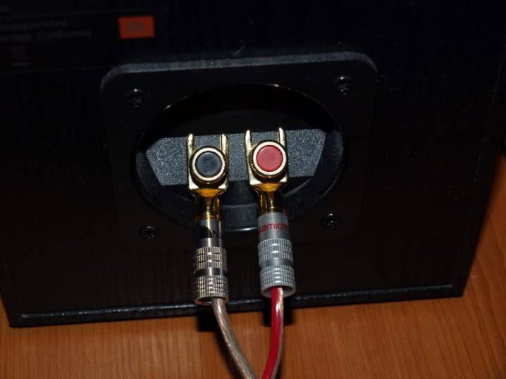 К колонкам присоединяется акустический кабель, который подсоединяется к батарейке. Это необходимо для того, чтобы достичь желаемого движения мембраны. Если получилось именно так, как запланировано, то акустический кабель, который ранее был закреплен к положительному полюсу батарейки, следует подсоединить к клемме красного цвета, а другой провод – к клемме черного цвета.