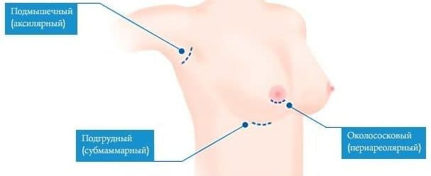 После определения объема протеза принимается решение о месте разреза. Здесь также есть нюансы. Например, при маловыраженной субмаммарной складке (СМС) проводить в ней разрез нельзя, и тогда прибегают к аксиллярному доступу (подмышкой), при котором рубец может быть заметен в течение полугода, а ход операции — более сложен. Наоборот, при выраженной СМС делается субмаммарный разрез, который дает больше возможности для обзора операционного поля. Но и у него есть минусы: более длинный рубец, а при проблемном заживлении имплант может выскользнуть из места разреза.