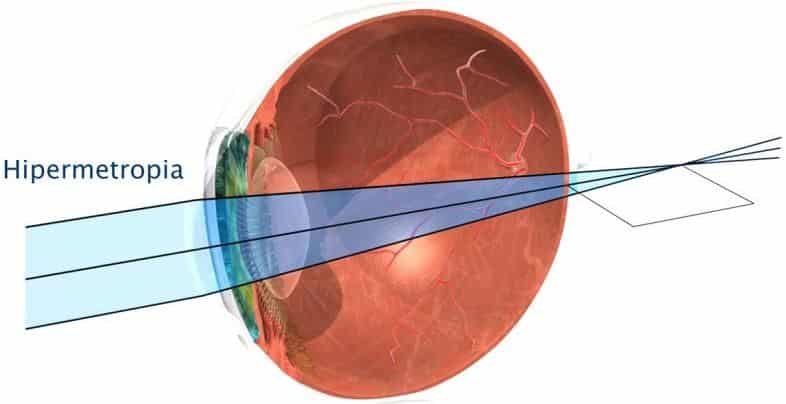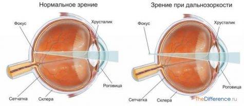 При дальнозоркости лучи света, проходящие через роговицу, преломляются не на сетчатке, а на области, расположенной за ней.