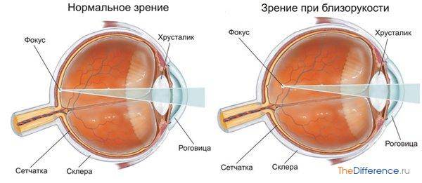 Мы часто путаем дальнозоркость с близорукостью. разница между дальнозоркостью и близорукостью состоит в том, что световые лучи, попадающие в глаз, при дальнозоркости проецируются за сетчатку, а при миопии — перед ней. Этот факт вызывает затуманивание зрения на близком и дальнем расстоянии соответственно.