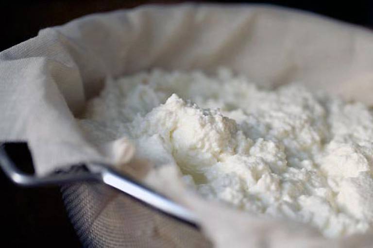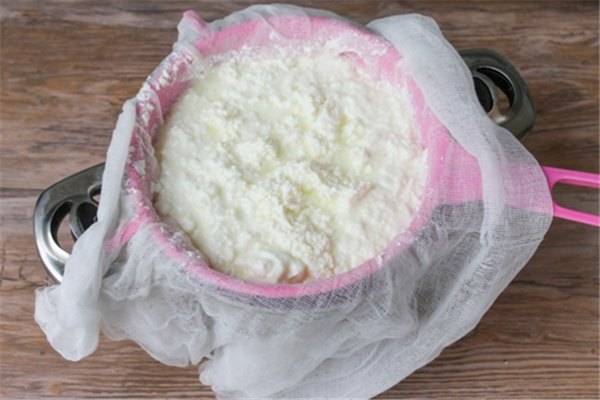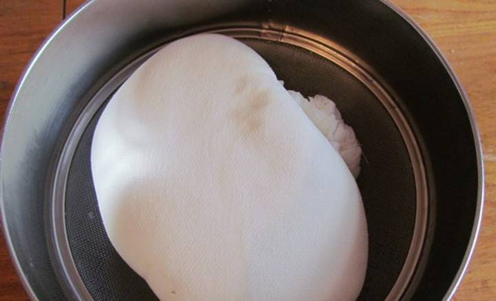 - После того как сыр приобретет характерную консистенцию, его нужно отбросить на марлю (сложенную в 2-3 слоя) и дать стечь сыворотке.