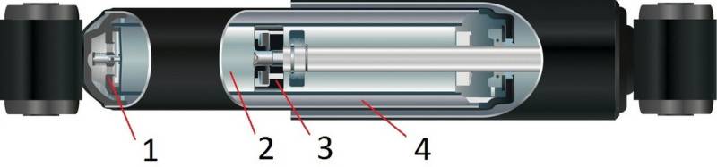 Конструкция, появившаяся еще в 30-е годы прошлого столетия и до сих пор не потерявшая актуальность. Телескопический гидравлический двухтрубный амортизатор (он же «масляный») состоит из двух полостей в виде труб, вставленных одна в другую. Во внутренней трубе располагается шток с поршнем, прикрепляемый к кузову.