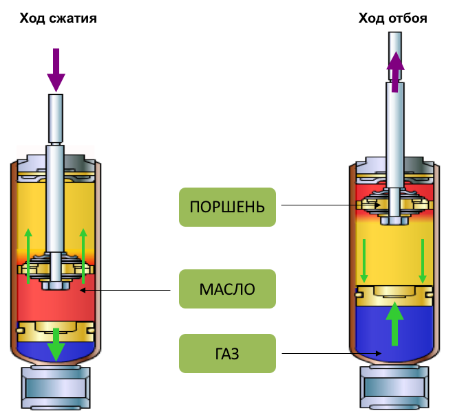 При наезде колесом на препятствие происходит процесс сжатия амортизатора — шток с поршнем во внутренней (рабочей) трубе перемещается вниз, выдавливая специальную жидкость определенной вязкости во внешнюю (компенсационную) трубу. При прохождении препятствия можно наблюдать обратный процесс — отбой амортизатора, при котором жидкость возвращается в рабочую полость. Гашение колебаний кузова происходит за счет вязкости жидкости — при перекачивании из одной полости амортизатора в другую она поглощает кинетическую энергию.