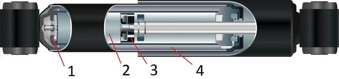 Здесь конструкция уже значительно отличается от двух первых предшественников – все дело в том, что это так называемый «двухтрубный амортизатор«.