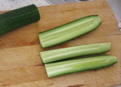 Огурцы и рыбу порежьте полосками. Огурцы при необходимости предварительно очистите от кожи и семян.