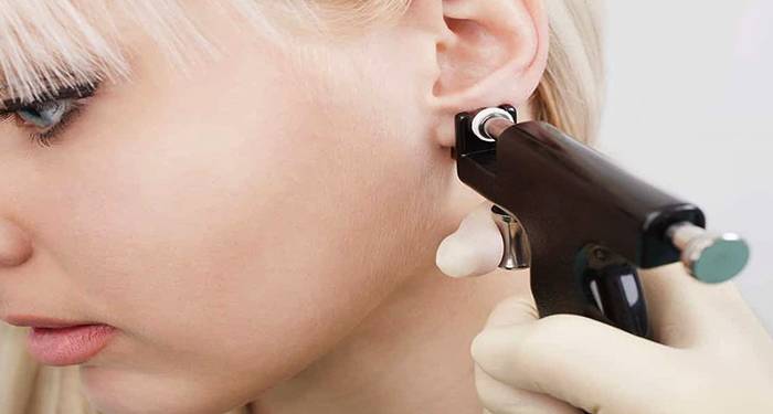 Мастера недорогих салонов часто используют пистолет. Такая процедура занимает минимум времени. Человек лишь слышит быстрый хлопок и не успевает ощутить боль.