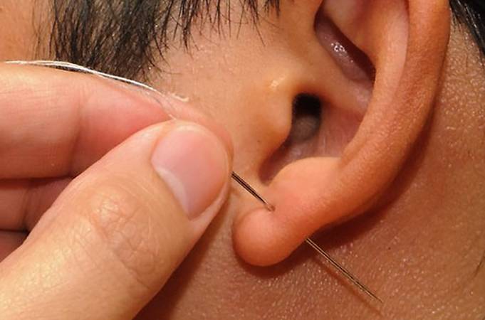 - Одной рукой оттягивают мочку уха, а второй в это время прижимают кончик иглы к отметке, сделанной йодом;