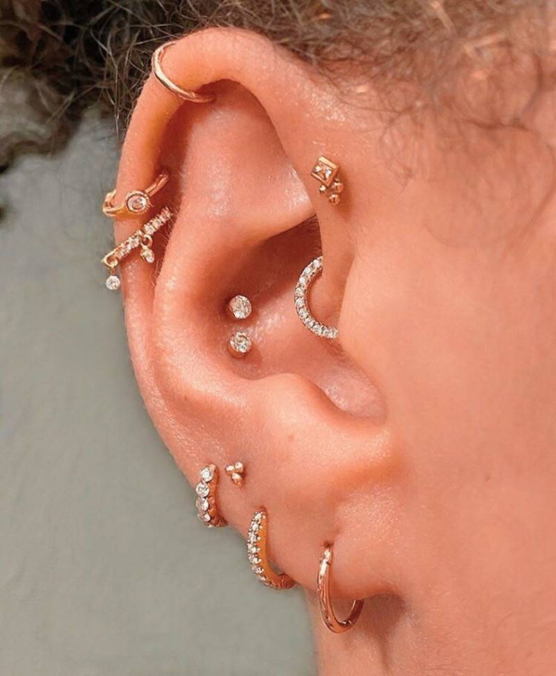 Пирсинг хеликс – это прокол завитка ушной раковины. Не самый болезненный вид пирсинга, при этом отличающийся достаточно длительным периодом заживления, который растягивается на срок до полугода. Подойдет тем, кто хочет носить серьги-каффы.
