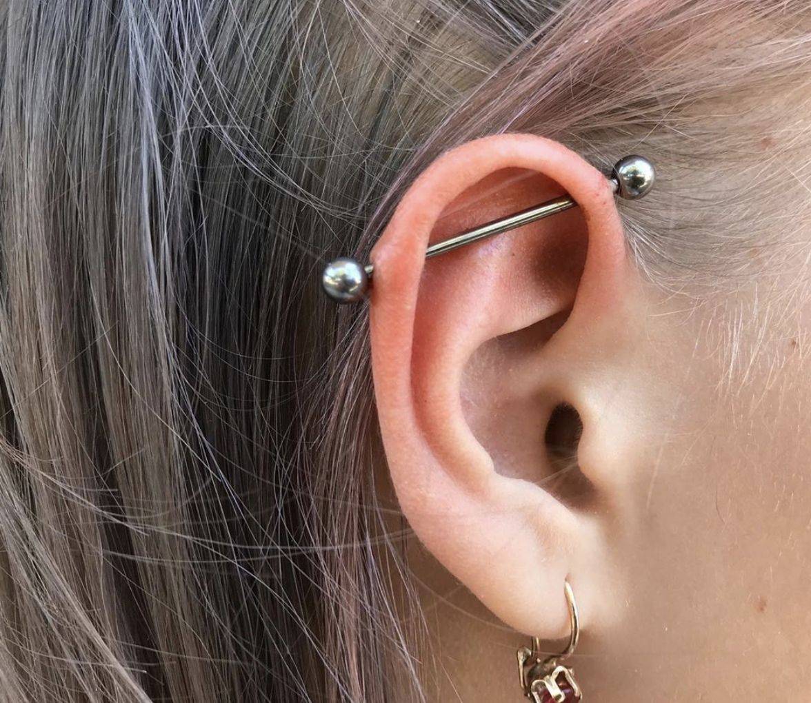 Пирсинг индастриал обычно делается в верхней части ушной раковины и предполагает создание двух параллельных проколов, соединенных одним украшением.