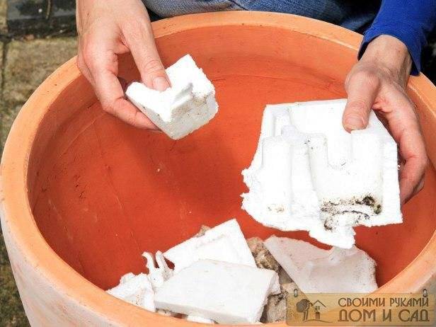 Это самый дешевый и легкодоступный материал для дренажа. Более того, в отличие кирпича, гальки и черепков, пенопласт значительно легче, а значит, не утяжеляет горшок.