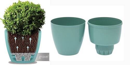 Простейшая конструкция состоит из двух пластиковых горшков, которые легко вставляются друг в друга. Внутренняя часть менее глубокая, у нее сетчатое дно и есть специальные ножки или выступы, благодаря которым эта часть не опускается слишком глубоко. Керамзит или другой дренажный материал насыпают в выступы внутренней части или в полость между донышками горшков. Это зависит от особенностей конструкции, у разных производителей они разные.