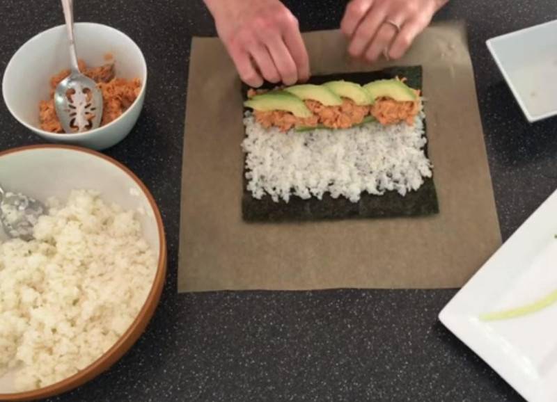 - На середину риса выложите полоску куриного филе, добавьте нарезанный огурец и авокадо. При желании можно добавить майонез.