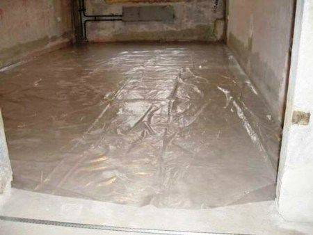 Чтобы четко понимать, что лучше использовать для стяжки пола этого варианта, стоит подготовить все вышеперечисленные элементы и всю поверхность укрыть пленкой. Те места, где есть стыки, стоит выполнить внахлест около 10 см. Стены тоже нужно заделать.