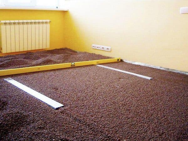 От обычной сухой стяжки данный вариант обустройства напольного покрытия отличается наличием дополнительного слоя. А именно под наполнителем располагается теплоизоляционный материал, такой как минеральная вата или плиты ЭППС. В результате чего основание и засыпка разделены. Подобный способ стяжки применяется с целью максимальной звукоизоляции. Также это обеспечивает дополнительную теплоизоляцию пола.
